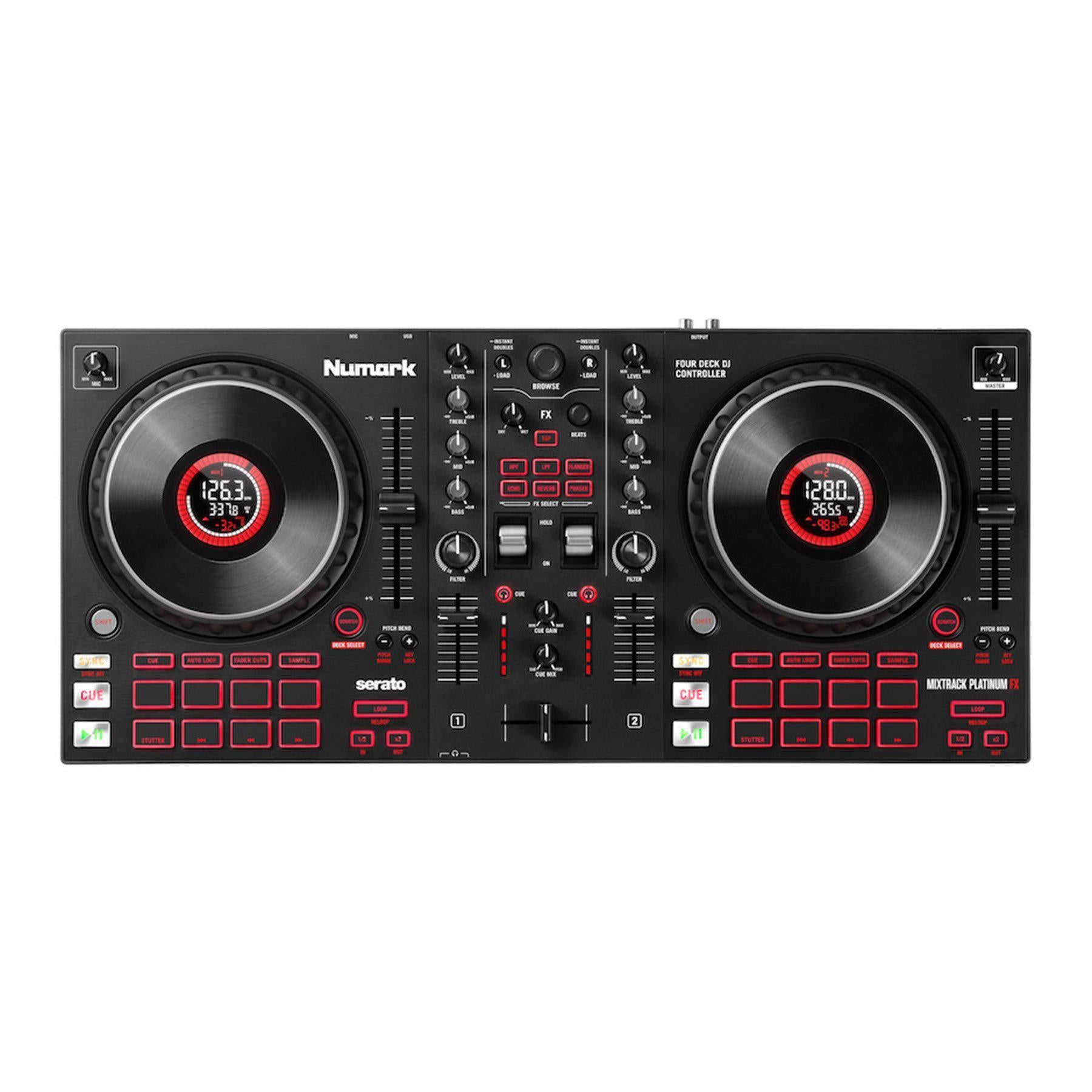 The crisp Mixtrack Platinum FX from Numark has all the essential features you need to be a DJ! The Mixtrack Platinum FX is essentially a 24-bit , 4-deck digital DJ controller with a dedicated software effects section , large 6" capacitive-touch jog wheels with built-in hi-res displays and 16 multifunctional performance pads .