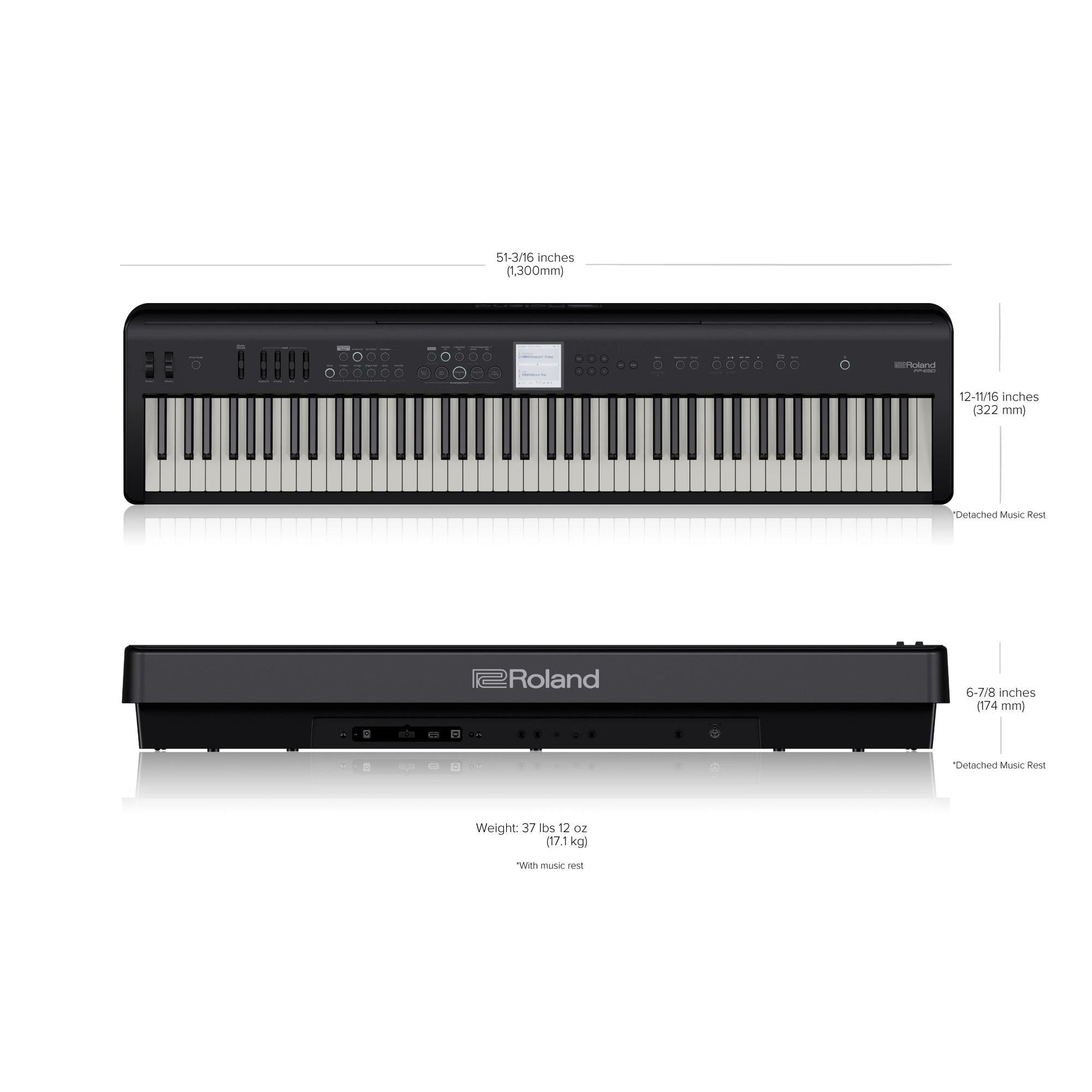 Dimensions Detached music rest: 1,300 (W) x 322 (D) x 174 (H) mm 51-3/16 (W) x 12-11/16 (D) x 6-7/8(H) inches