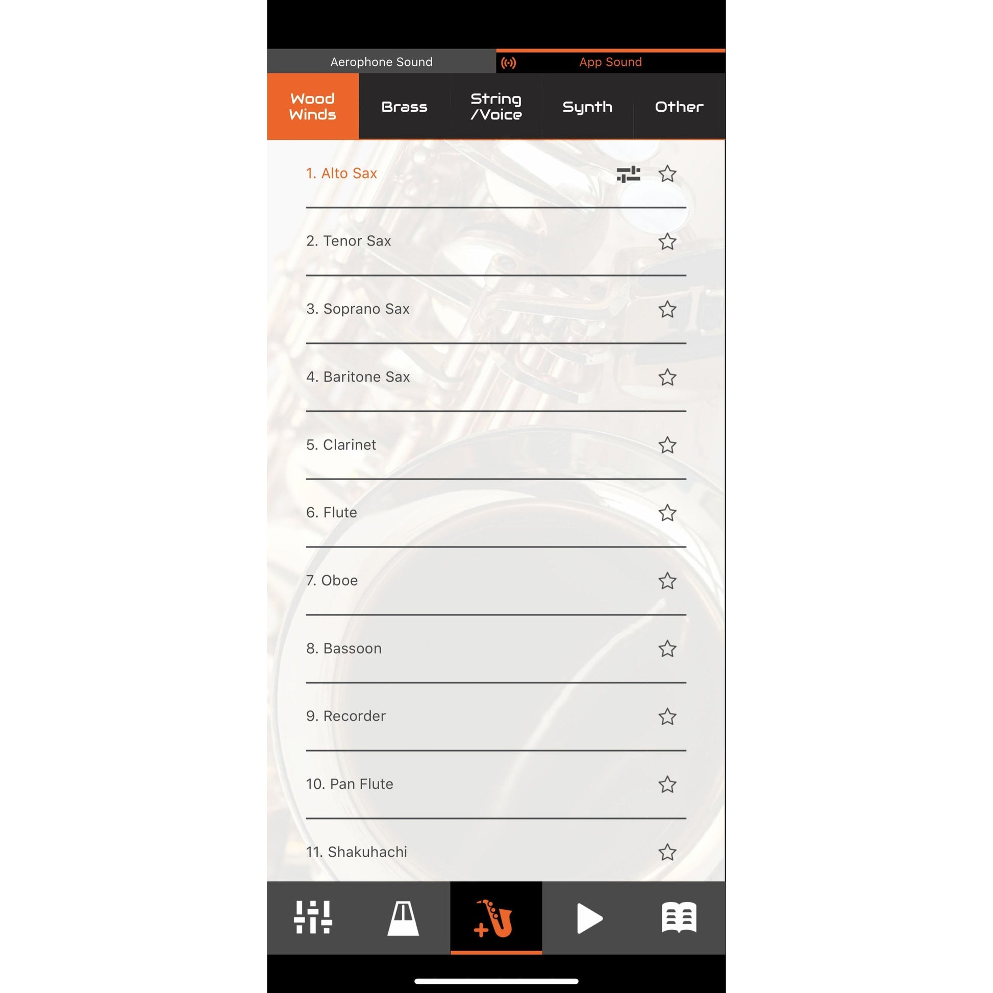 Aerophone mini tilbyder en bred vifte af instrumenttyper du kan spille til din yndlingsmusik. Saxofon, fløjte, violin, klarinet, trumpet og synthesizerlyde er indbygget og giver en bred vifte af lyde du kan udforske. Og ved at tilslutte Aerophone mini Plus app via Bluetooth har du adgang til over 50 mere. Lyde, der er organiseret i app’en, så det er nemt og enkelt at finde nye lyde.