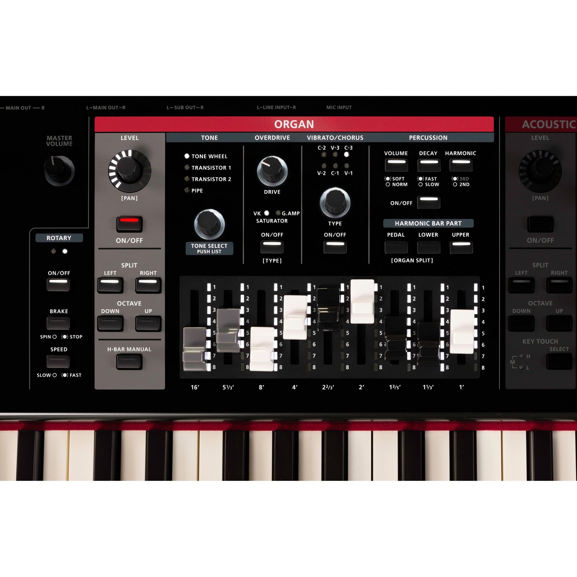 Orgelsektion med tre-lags Virtual Tone Wheel-teknologi, to vintage-transistortyper, en pibeorgeltype og nye overdrive- og roterende højttalereffekter